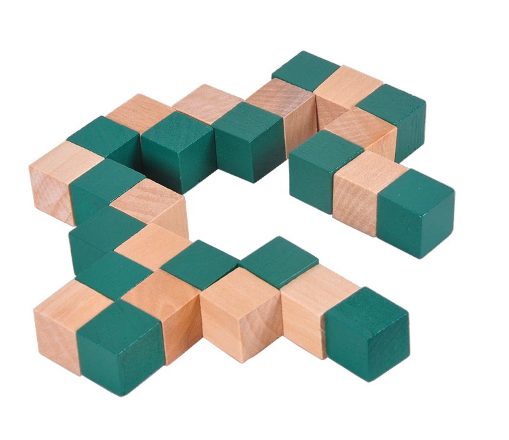 Drevená skladacia kocka je kreatívny hlavolam skladajúci sa z niekoľkých malých drevených kociek, ktoré sú prepojené pružnými gumičkami.